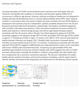 يوضح ملخص هذه الدراسة الأخيرة حول وفيات حقن كوفيد-19 أن “التقديرات الدقيقة للأحداث الضارة الشديدة ومعدلات الوفيات الناتجة عن لقاح كوفيد-19، هذه التقديرات ضرورية لحساب نسبة المخاطر مقابل الفوائد للتطعيم (والجرعات المعززة) ضد فيروس كورونا في مختلف الفئات العمرية “.
